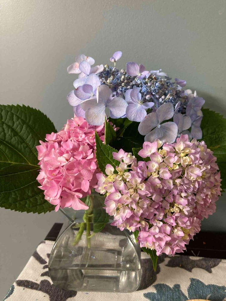 紫陽花は今が盛りのニューヨークです。色とりどりに咲いて嬉しいので、少しだけ切って生けてみました。