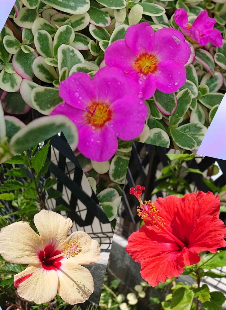 おはようございます😊久しぶりに庭のハイビスカスが咲いてくれてました🎵ポーチュラカも咲きカラフルでかわいいです❤️
