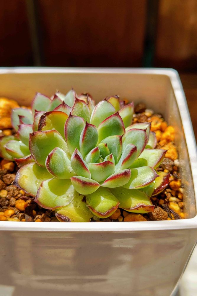肉厚の葉で縁の赤さが気に入っています🤗✨外葉がちょっぴりチリってますが、わりと強いこなのでズボラな私にピッタリです(*´ω`*)