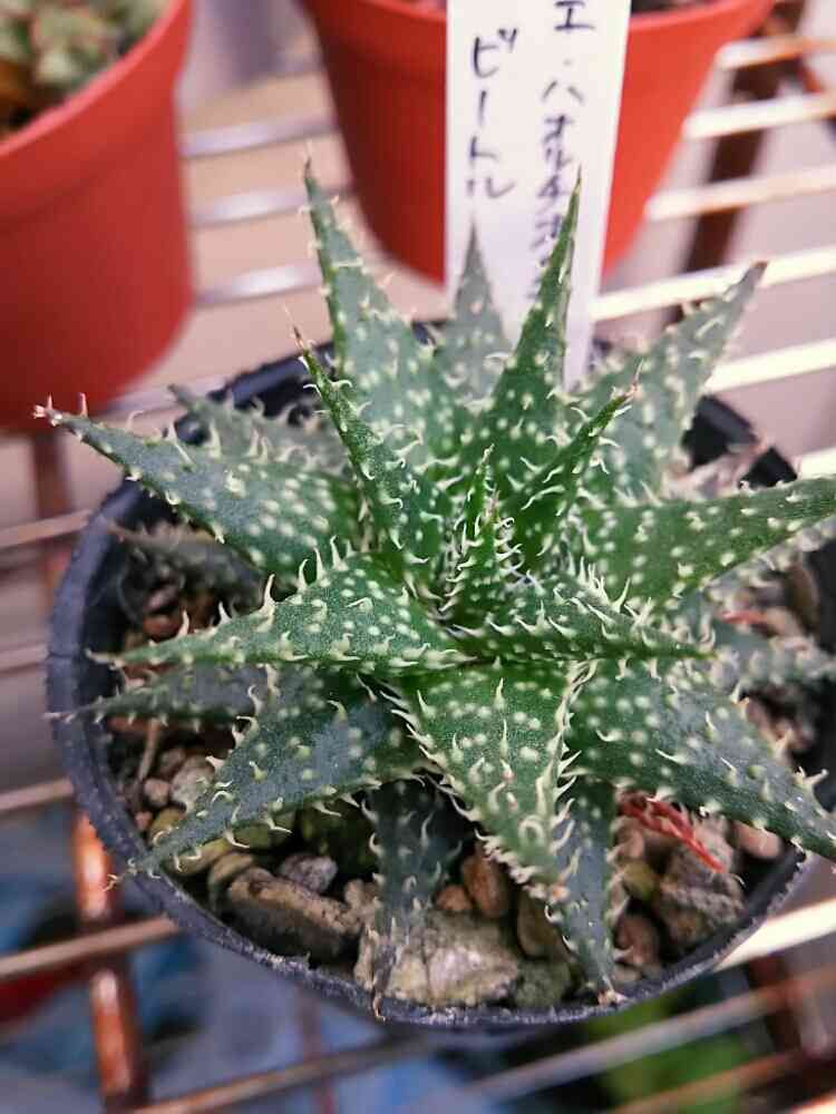 今日のお迎え多肉植物その2。アロエとハオルチアの交配だそうで。トゲトゲが新鮮でお迎えしました。