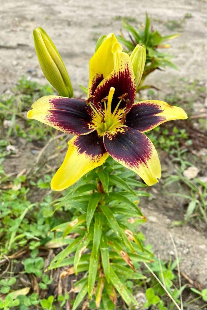 黄色い花びらの中心に赤茶色の模様が入る独特なスカシユリのピエトンに出会いました。