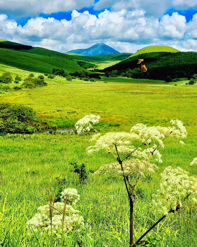 青い空と蓼科山、明るい緑の湿原、白いシシウド、オレンジ色の蝶々が、とても綺麗に見えました。