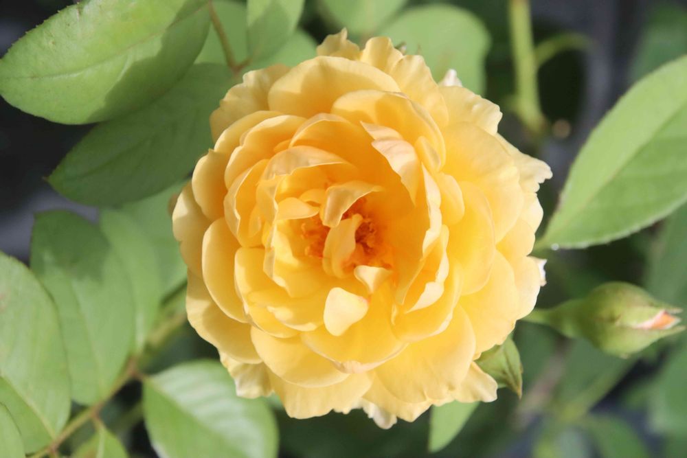 庭でバラの二番花 グラハムトーマスが咲いています。花数が少なくて少し小ぶりですが、一つ一つの花はほぼ一番花と同じです。