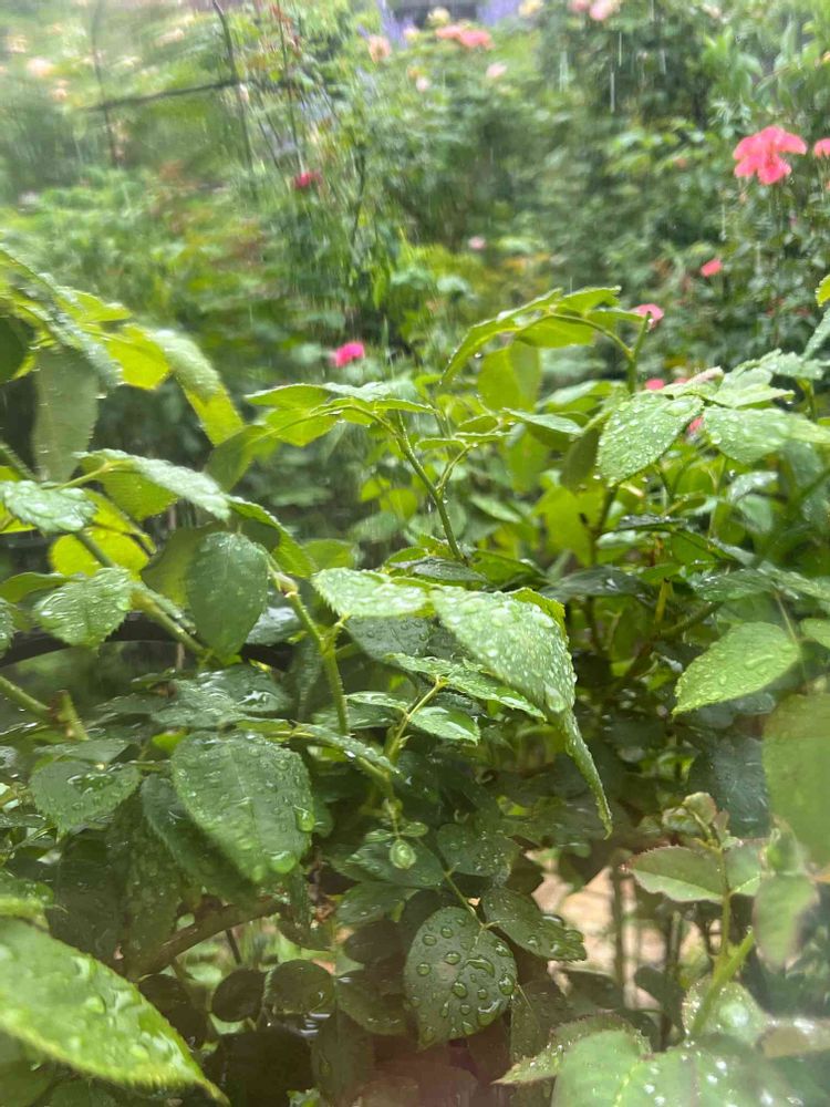 窓から外をニヤつきながら眺めてましたが、バラもひさしぶりにシャワーを浴びて「極楽〜🚿」と言ってるようでした。