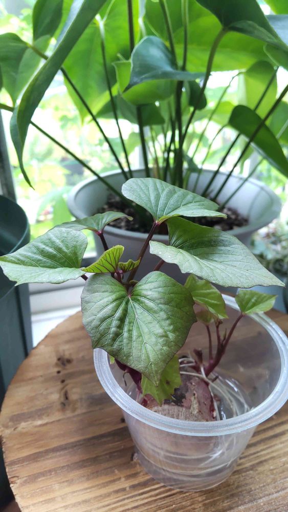 ちょっと前に見たらサツマイモに芽が出てたのでカットして水に挿してたら良い感じに伸びて来ました🌱