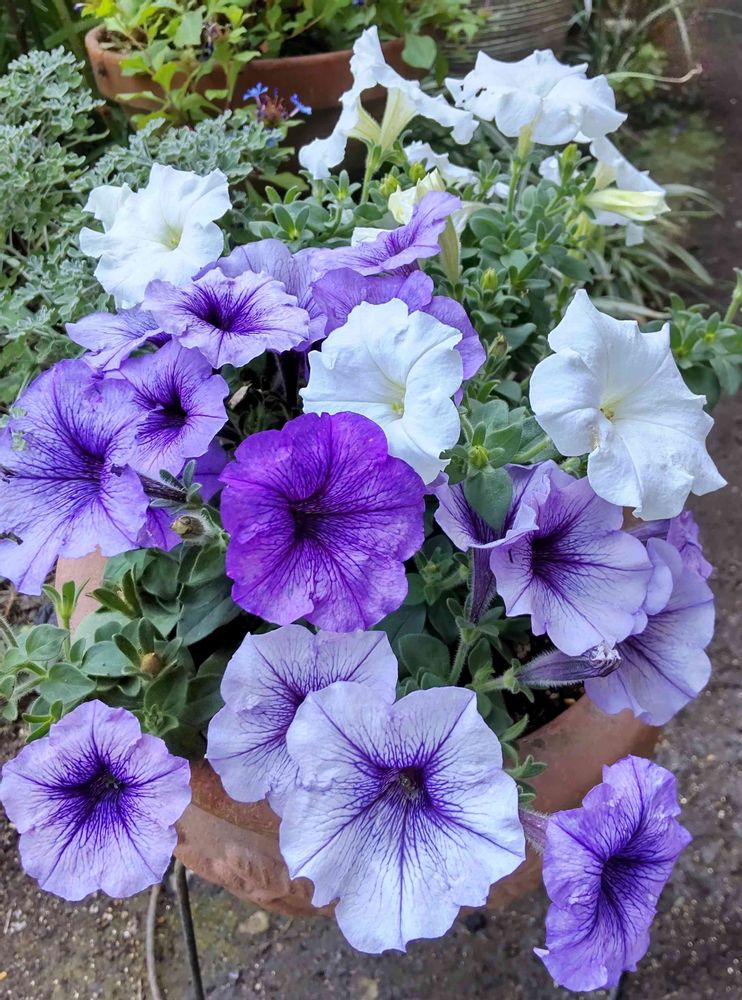 白いペチュニアがお値打ち品(48円)だったので、それに合わせて定番の青紫色(98円)を植えました💠