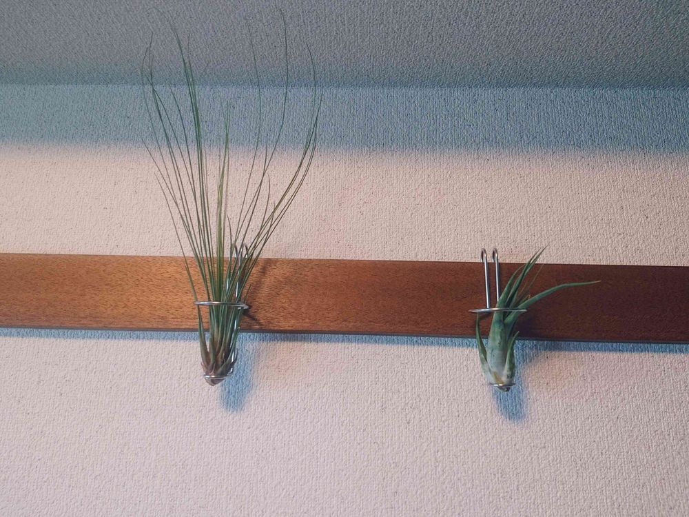 セリアで売ってたハンギングステンレスチューブホルダー(歯磨き粉をぶら下げるやつ)にエアプランツを置くと良い感じに。