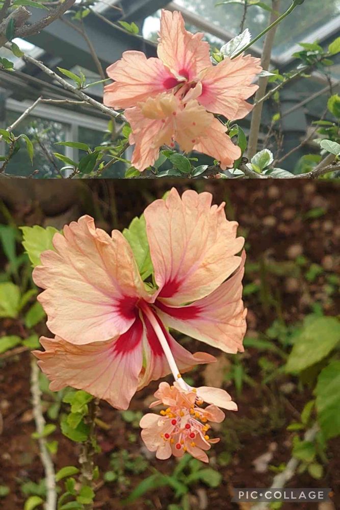 ハイビスカス フラミンゴ、華やかな二弾咲きに、まるでフラミンゴそのものの色合い、羽ばたきそうですね!🦩😍💗🧡🌿✨