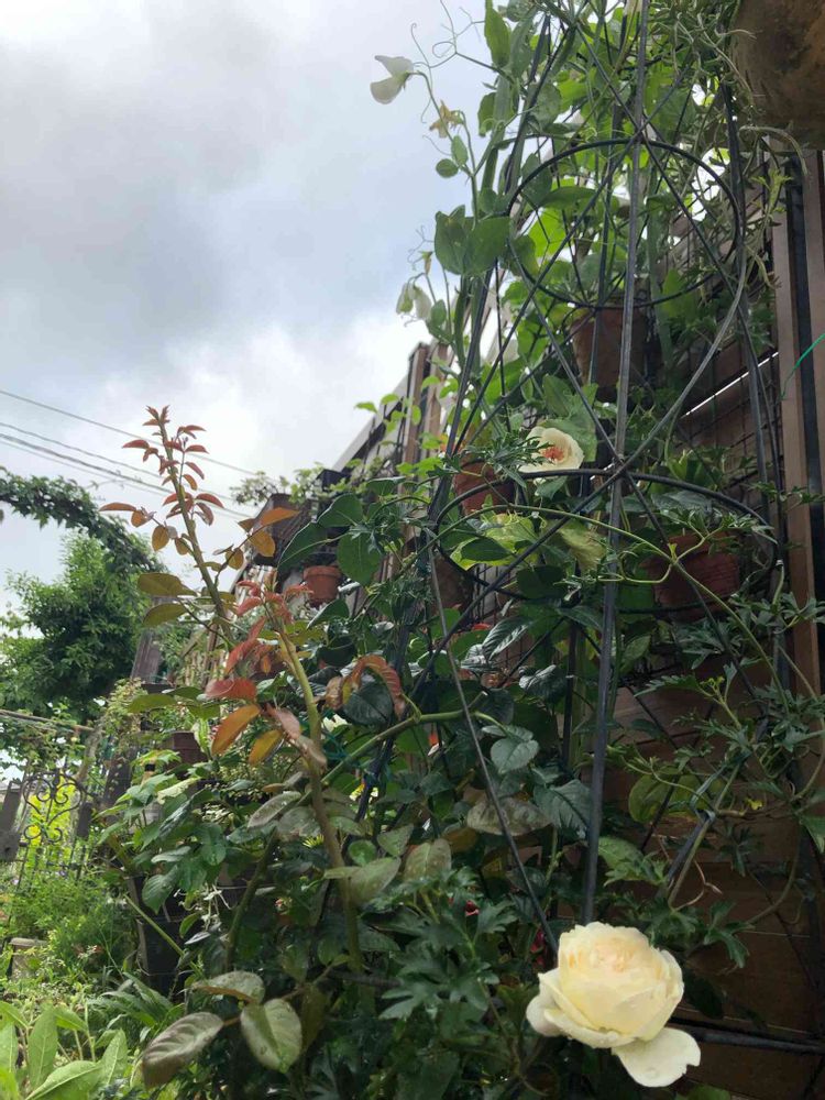おはよう御座います。緑豊かところのクリーム色の薔薇がとても映えますね。加えて清々しい青空に全てが活き活きとしています。素敵なお花を有難うございます。