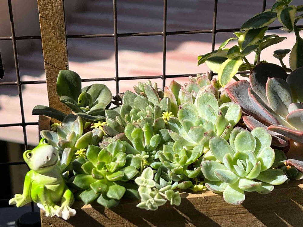 寄せ植えにseriaの🐸置いたけど、みどりん達の中じゃわかりづらい💦💦フチ子さんみたい💓
