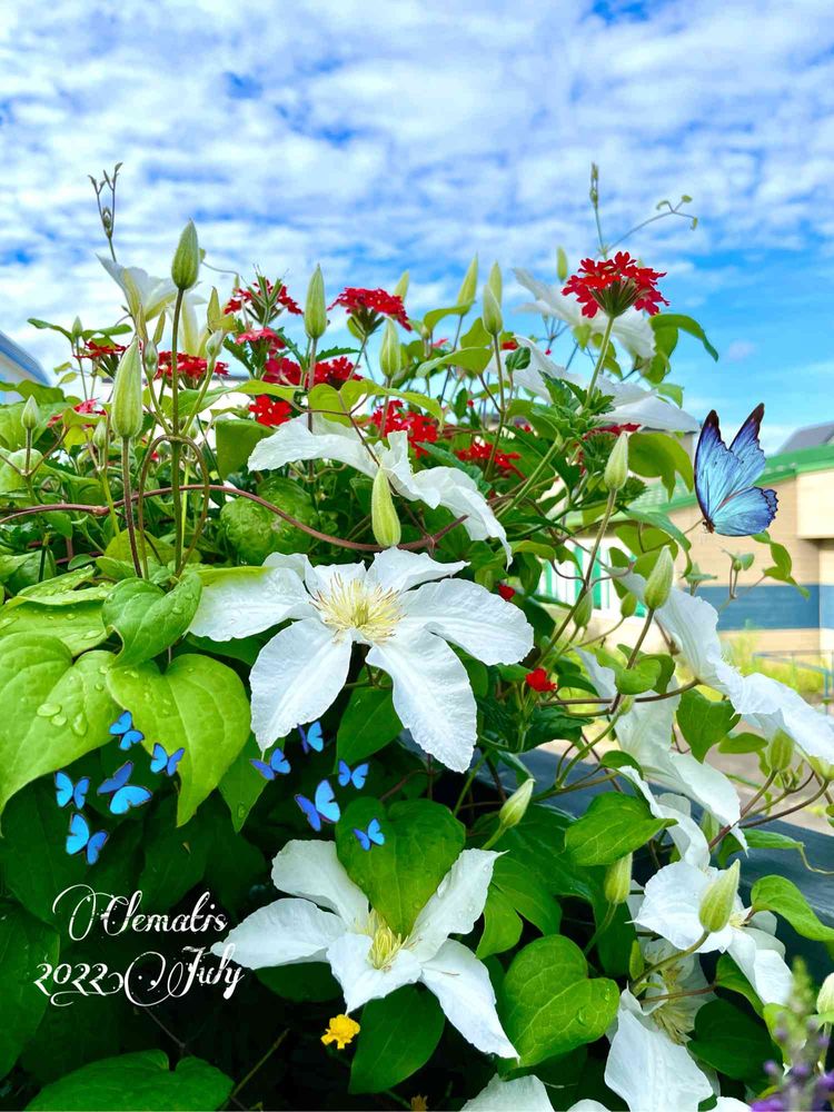 真っ白なクレマチスと赤いお花と青い空がとても良いですね💕