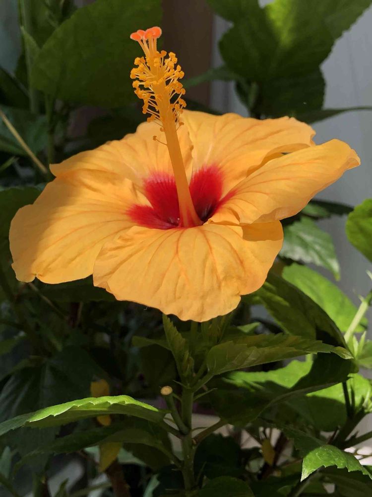 朝、庭の掃き掃除していて、お隣の窓際にこのハイビスカスが咲いていました。