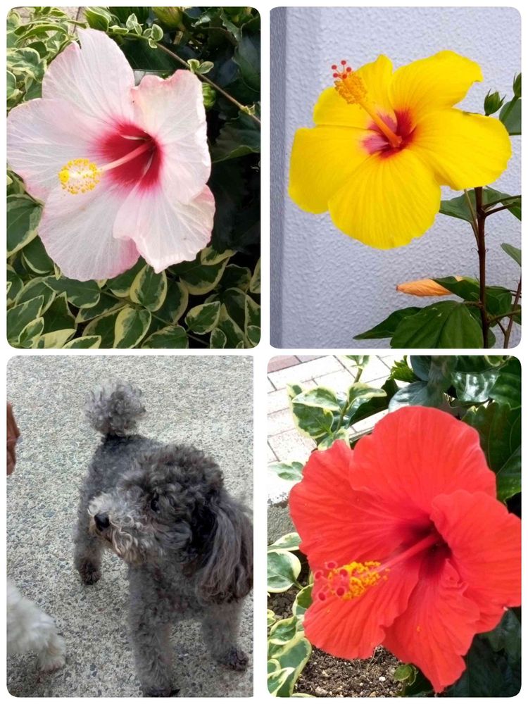 左上↖️と右下↘️(ブッソウゲ)(仏桑華)(ぶっそうげ)右上↗️(ハイビスカス)
