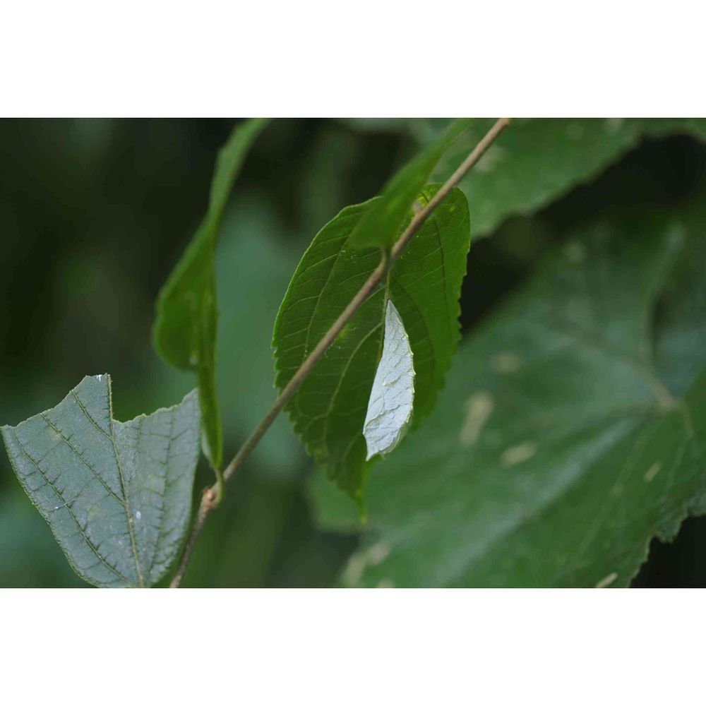 葉っぱの裏が二つ折りになったように見えますが、これは葉っぱでは無くアカボシゴマダラのさなぎ何だそうです!!