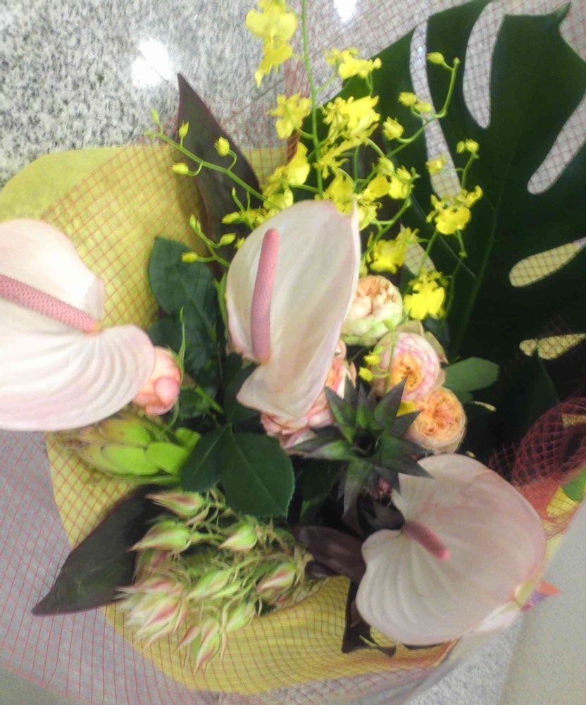 トロピカルなアンスリウムだけど、やさしい色合いで。