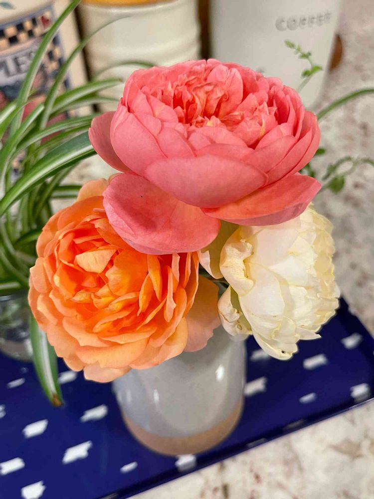 ストームの予報が出ていて風が強くなり空も曇ってきたので、慌てて外に出て咲いているものを切り花に---取り込んだのですが、あれ青空が⁈