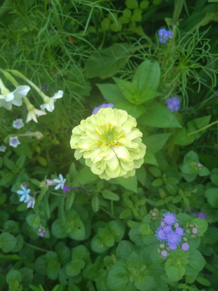 ブルーガーデンにライム色のジニアが咲きました🙌✨