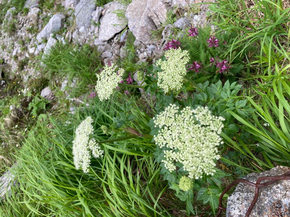セリ科ミヤマゼンコ、右下はハマウツボ科ミヤマシオガマ
