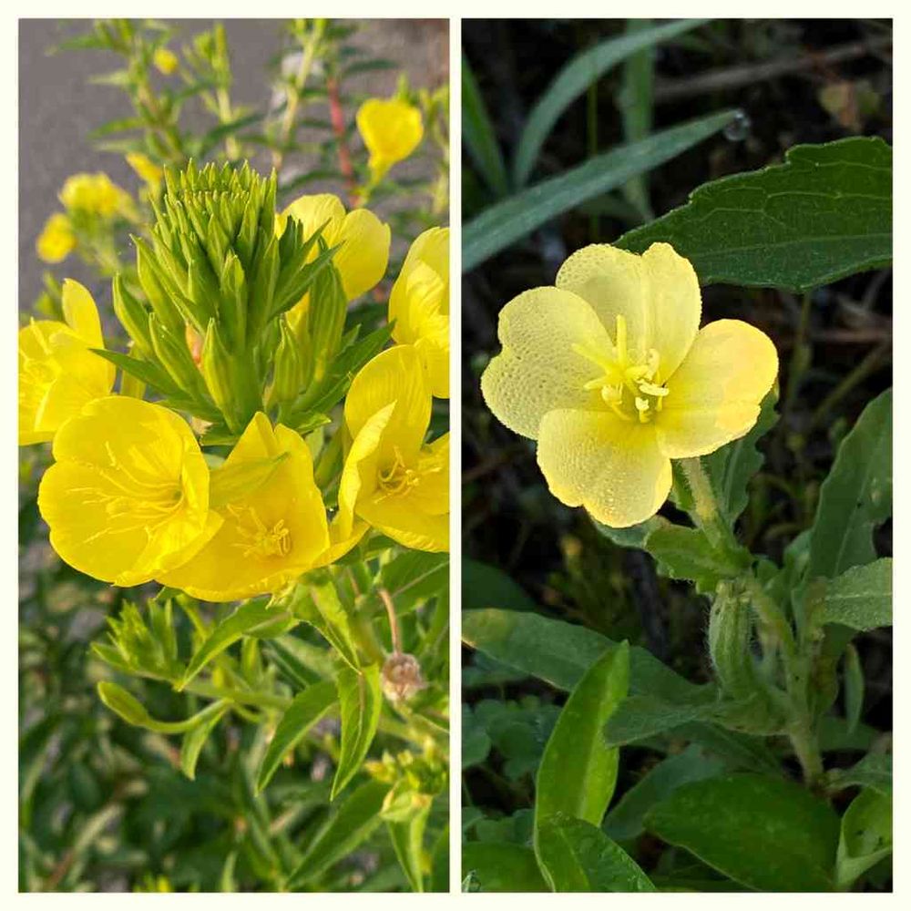 コマツヨイグサ(右)と、メマツヨイグサ(左)・・夕方に咲いて、翌朝萎みますが、早朝散歩に行くとまだ咲いていて、嬉しくなります。