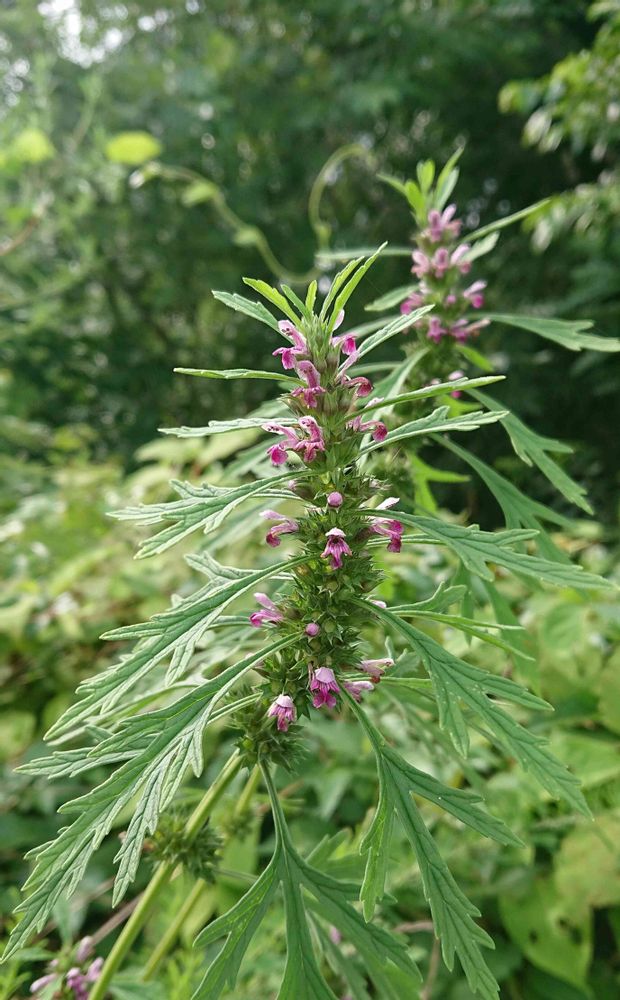 シソ科メハジキ属の多年草。野原や道端、荒れ地に生える。全体に白い毛が密生する。根生葉は卵心形で花期には枯れる。茎葉は深く3裂し、裂片はさらに羽状に切れ込む。花期は7~9月。上部の葉腋に淡紅紫色の唇形花を数個ずつつける。下唇は3裂し、中央裂片はさらに2裂する。赤いすじが目立つ。果実は分果。宿存萼の中に4個入る。萼は筒状で5裂した先端は細く尖り、果実期は目立つ。