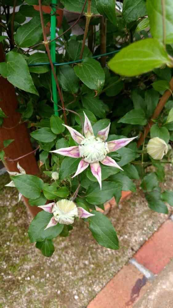 クレマチス/ベル・オブ・ウォッキングが咲き始めました。12個が同じように開きました。とても変わっています。まだ、美しいとは言えません。