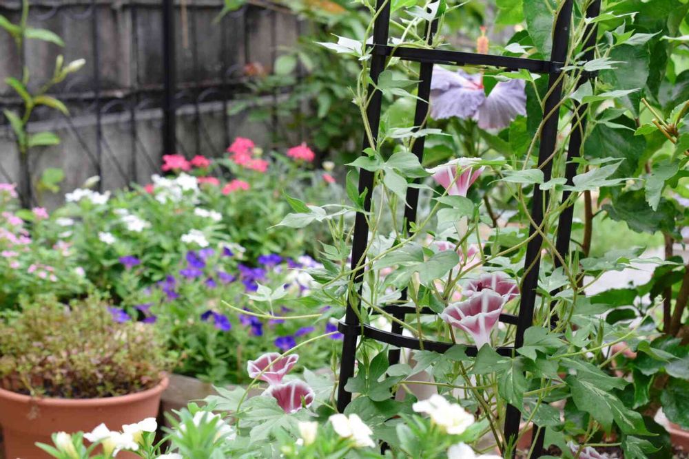 残った朝顔の苗は鉢植えのトレリス仕立てにしました。