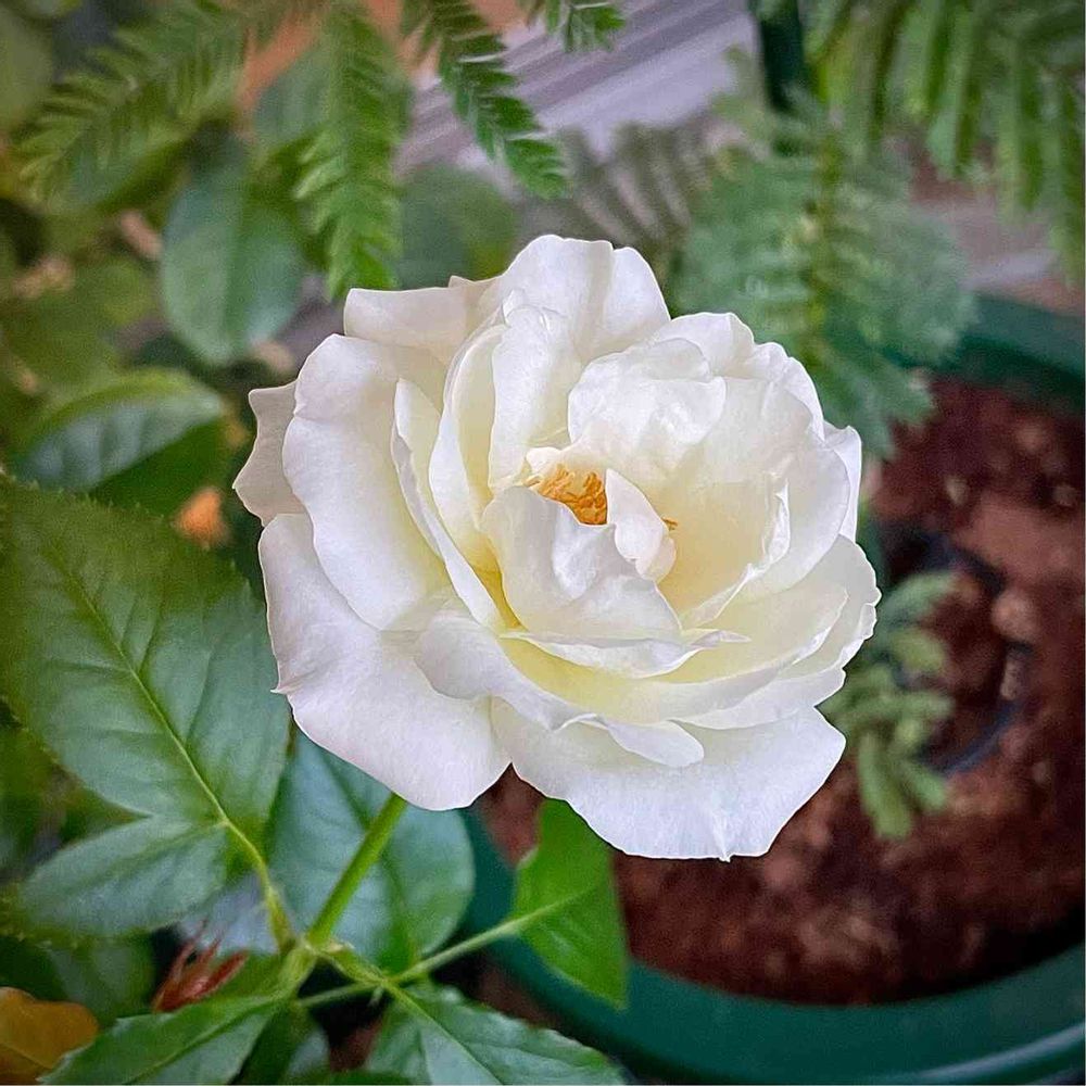 グラシアールさん咲く。『嵐が丘』作者のエミリー・ブロンテのバラったらこういう白の花弁控えめイメージなんですよね。デイビッドオースチンのかわいい杏ピンクのフリフリではなく(あれはあれでバラとしてはすごく好き)