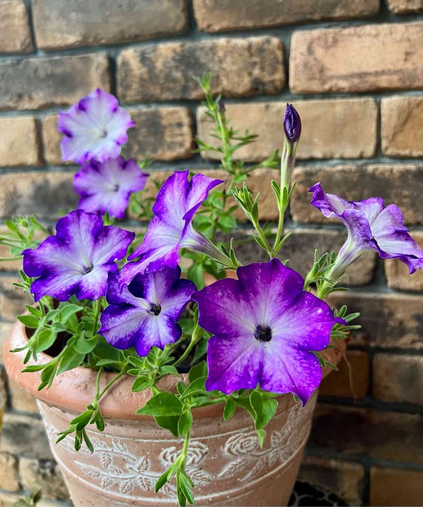 植木鉢と合ってて趣きのあるペチュニアですね💜💙💚