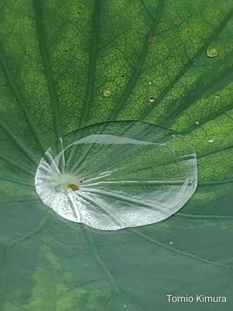 散歩道(京都丹波亀岡 南郷池)の蓮葉に、雨水が溜まっています。
