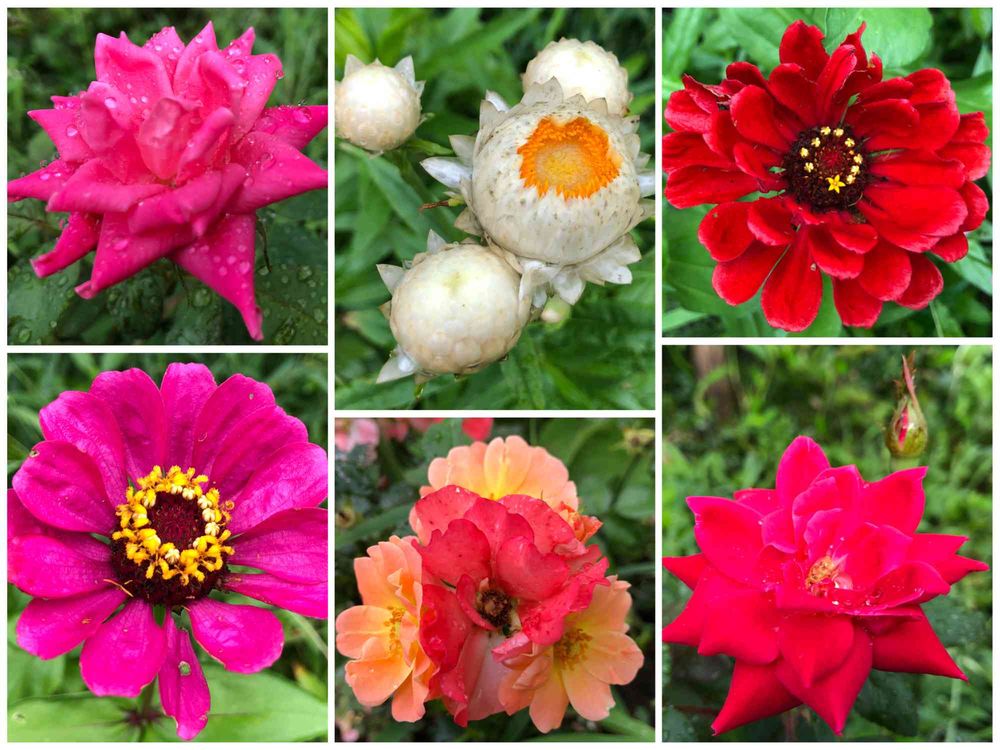 今朝のお庭、雨☂️露に輝く花🌼🌸たち。