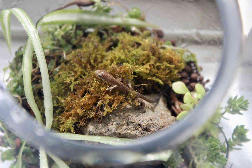 さん、カナヘビ平気です?ベビちゃん霧吹きされて頭テカってます😂急遽産まれたので即席テラリウムは家にあるものです。餌のアブラムシも家にあるものです😁