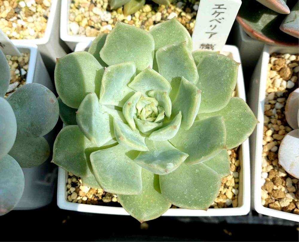写真はエケベリア織姫です。七夕に投稿したらよかったのになあと今思いました。これは、もうずっとずっと何年か前に星美人ばっかり育てていて、まだエケベリアという言葉も分からないときに知人から葉っぱをひとついただいて、初めてエケベリアの葉挿しに挑戦してできた苗です。ずっとずっと芽も出なくてゆっくりだったのに去年の秋くらいから急に大きくなって少しずつ大きくなりながら丸い花みたいな形に整ってきました。かわいくて、外を見に行ったときにずっとニヤニヤして見てしまいます。