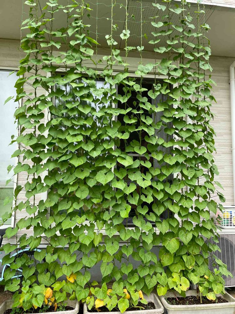 朝顔のグリーンカーテン素晴らしいです👏我が家でもやっているのですがバランスよく育てるの難しいです💦