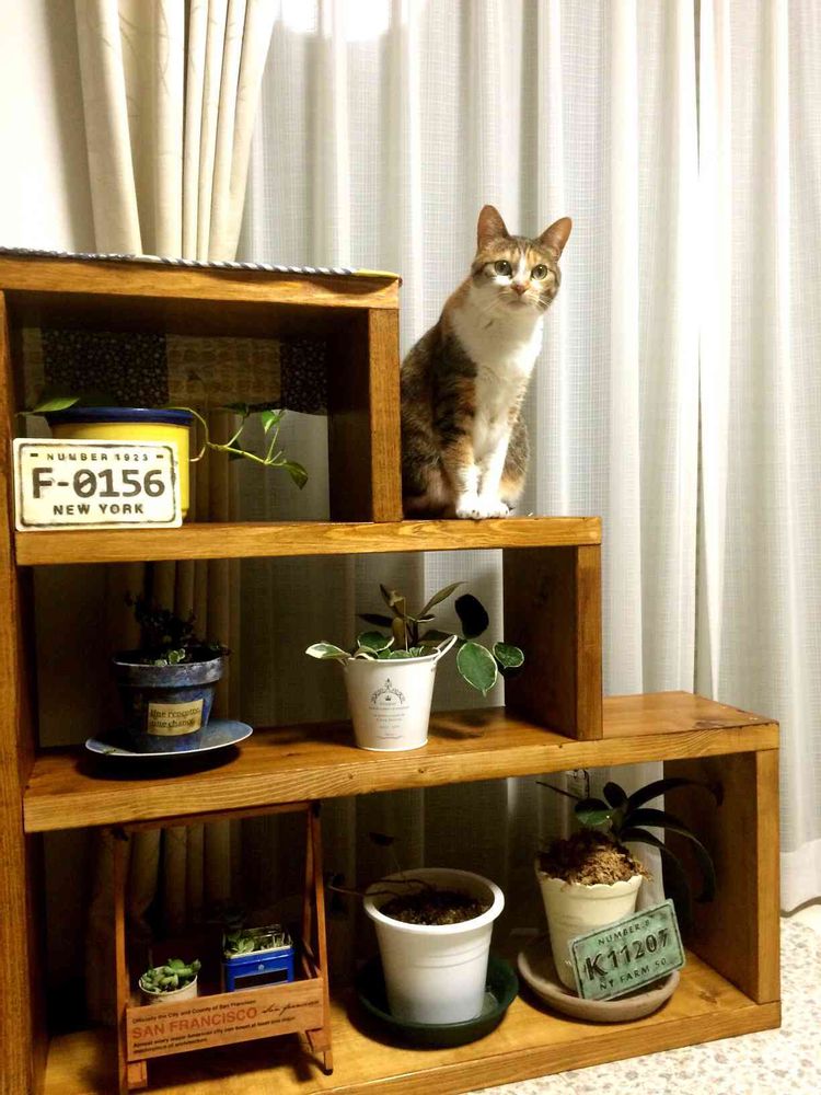 連休中、旦那に猫&植物用の棚を作ってもらいました(^^)✨