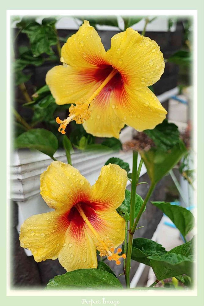 昨日の朝、大雨のあとに庭をパトロールしたら…2輪の✨ハイビスカス✨が立派に咲いています🥰