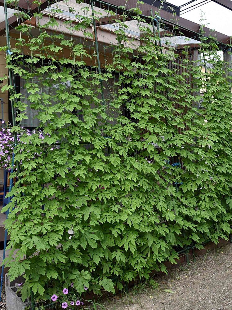 緑のカーテン、苗植え付け後47日目。完成(?)まで、6から7分目あたりでしょうか。🔶🔷🔶
