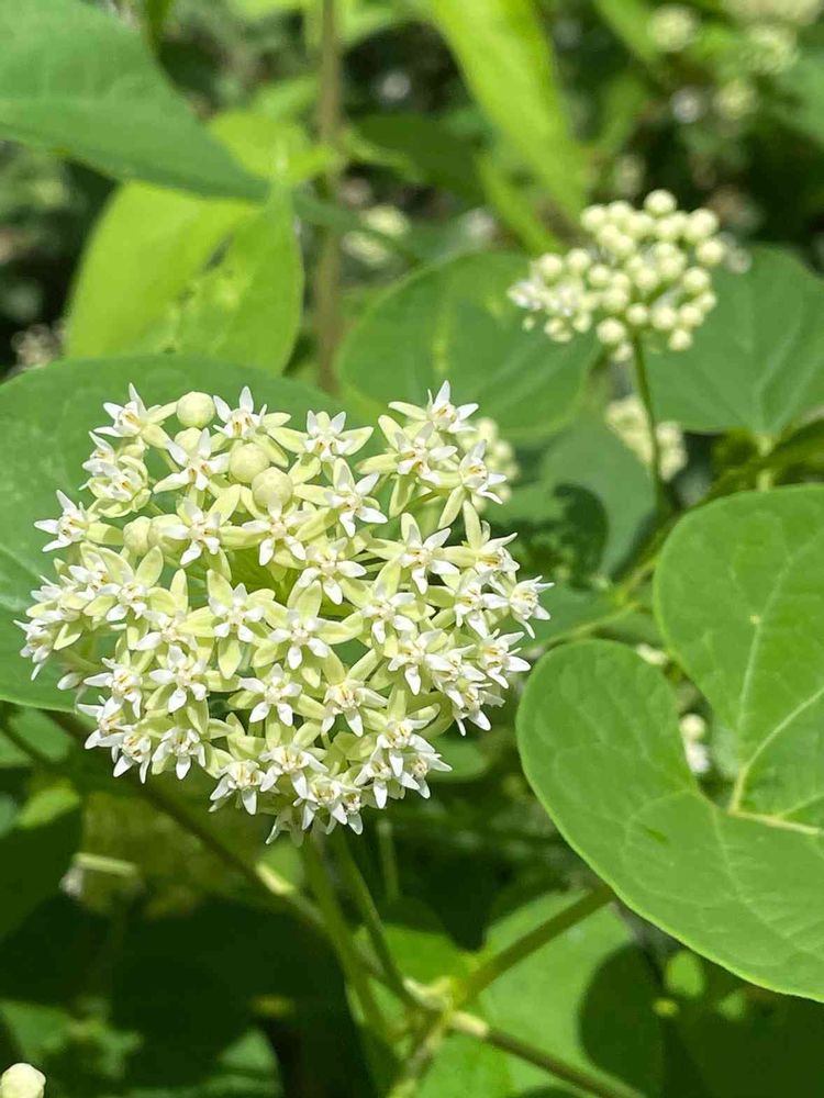 八ヶ岳南麓の森の林縁で見かけた。卵型の葉を対生させた蔓性で2〜5mにも伸びる。葉の基部はハート形。花は丸い散形花序でなんとも愛嬌がある。実は小さな白い花に見えるのは副花冠で、外側の花冠は黄緑色で反り返っている。