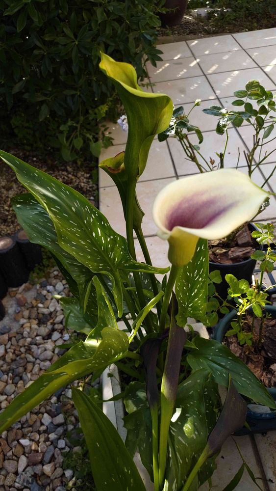 こちらのpicは球根から育ててるカラーなんですが最初出てきた色は手前の白ぽいピンクなんですが…これが本来の色。次に2本出てきたカラーはグリーン色で白ぽくなるかなと様子見ていましたがいつまで経っても白ぽくならずグリーンのまま💦💦
