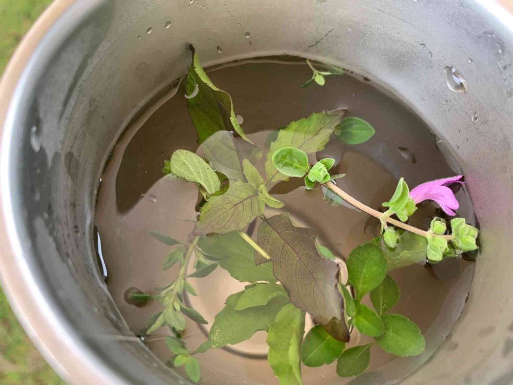 タンブラーに水を入れ、ハーブをちぎって投入。