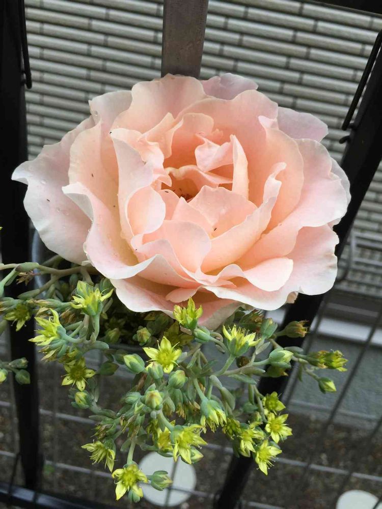 私の1番大好きなバラの1番バラが咲きました♡背が高すぎてお顔が見えなかったので切り花にしてシュウレイの花芽とコラボ。香りが良いから虫さんもいっぱい🌀