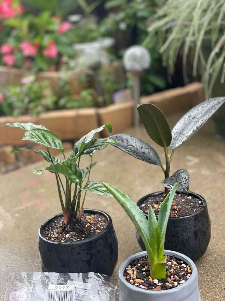 一昨日、ダイソーさんから連れ帰ったカラテアさんと男前フィカス。庭先で子どもが出来てたアガベの3つを植え込みました😊