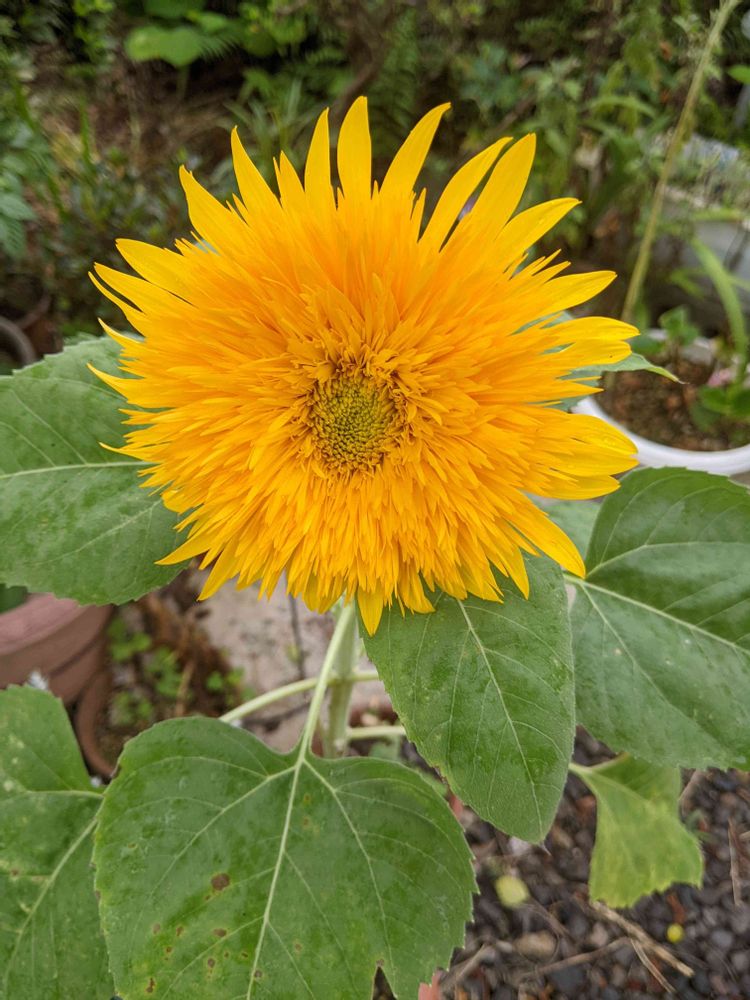 小さい鉢に。ちょこんと、咲いてます。八重咲きの向日葵!私には、このくらいの高さが、丁度良い。😅