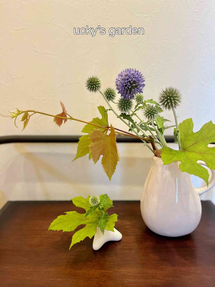お豆みたいに小さなルリタマアザミは小さな花瓶に分けてみた😆