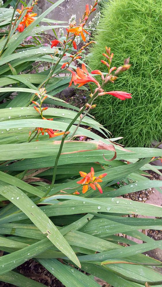 本当によく降りますね☔️ヒメヒオウギスイセンの葉に水滴💙コキアのグリーン💚も鮮やか💚