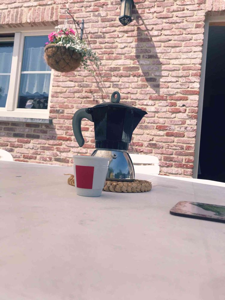 イタリアですっかり美味しいエスプレッソを飲んでいたので トニーに頼んで買って来て貰ったエスプレッソマシン☺️ 夫はちゃんといれられる様になり日に2回美味しいエスプレッソを飲んでます。パラソルの下では外で飲めるのがベルギーの良い所ですね。