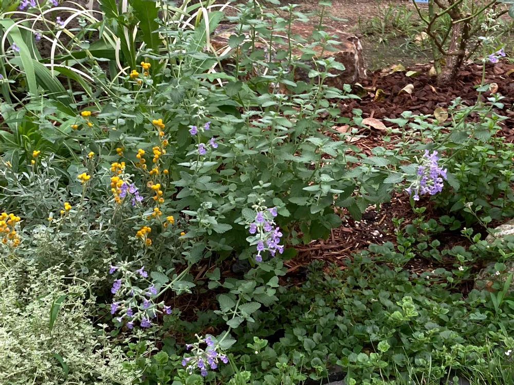 ごちゃごちゃ花壇の奥はオルレア、ギリア、セリンセなどが終わって抜いたまま。