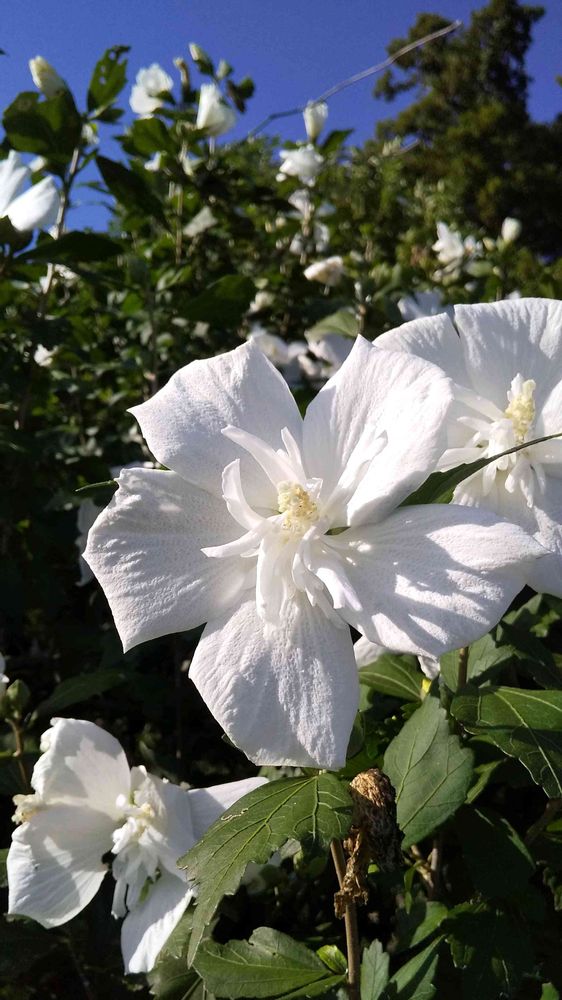 半八重咲きの白い花と濃い緑の葉が青空をバックに涼しげでした。