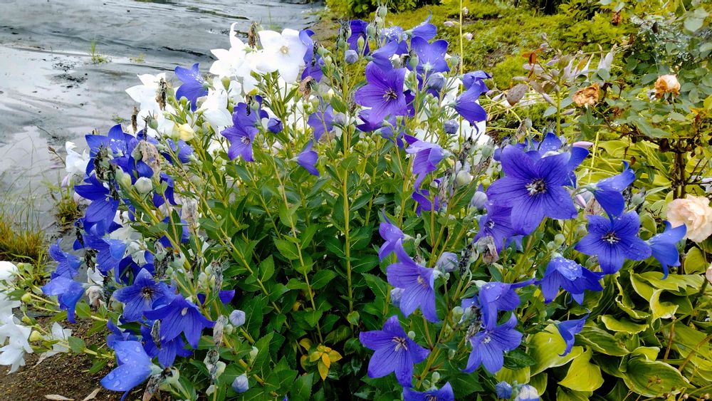 秋保ヴィレッジ庭の桔梗、白と紫。もう地面が雨でドロドロ泥濘んで中に入れなかったよ😱