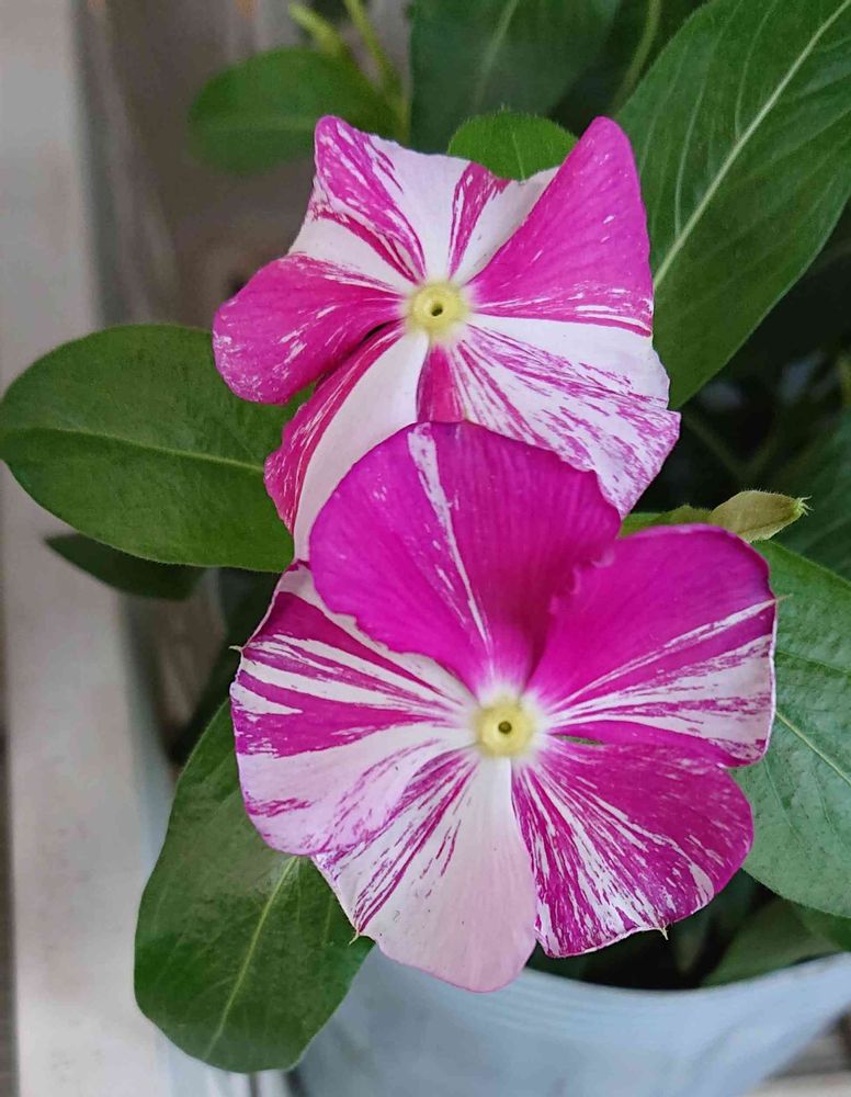 珍しい絞り模様のニチニチソウですね😍🌸🌿