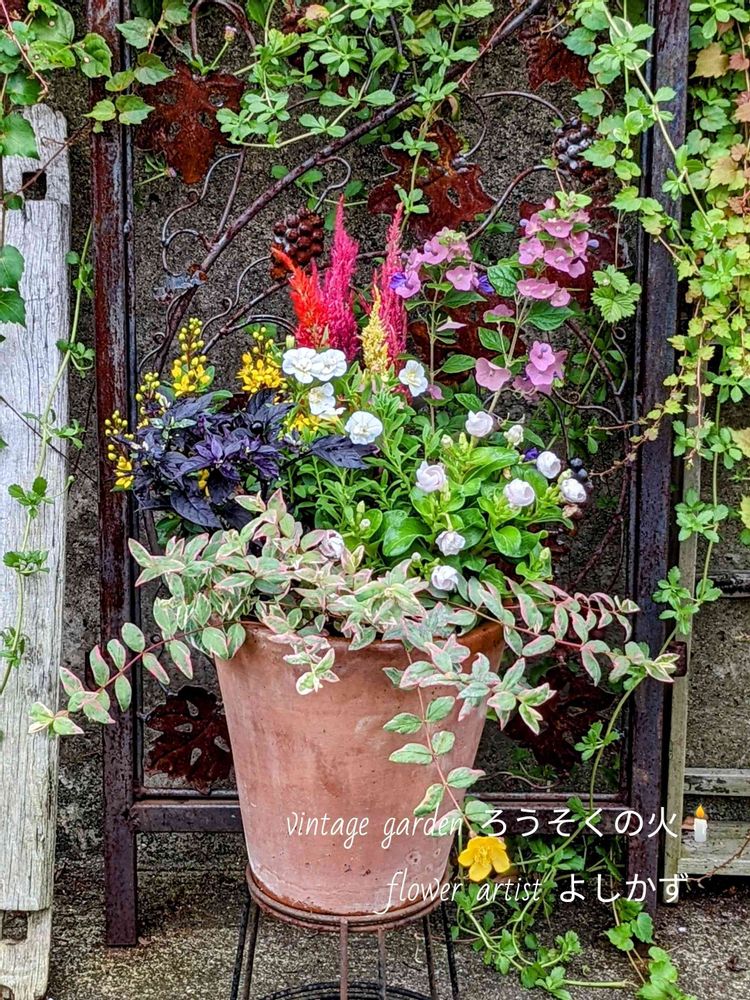 あったかい、キャンドルも灯っているー💘いつもながら、背景まで取り込んでいるニクーイ💚つた系がバック盛り上げてますねー。💚何でこんなにステキな寄せ植え、できはるんですかー💘